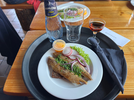 Lunch på Gudhjems rökeri innebär givetvis ”Sol over Gudhjem” = Rökt sill på rågbröd med